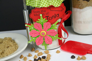 Use glue dots or foam tape to attach the label and snowflake to the jar. You may have to adjust your ribbon/bow to be off to the side so your die-cuts will lie nicely. I found it easier to make the layered snowflakes slightly off-center to the left of the personalization stamped on the kitchen label so the name shows completely.