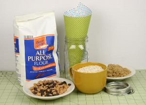 Pick your favorite cookie recipe and fill your jars starting with the flour, soda, salt and baking powder at the bottom, then adding sugars, oats and finally any mix-ins such as chocolate candies or flavored baking chips. Add the seal on top, but hold off on adding the ring just yet. (Note: You’ll find it nearly mess-free if you create a simple paper cone from cardstock or cardstock-weight patterned paper. You can roll your paper into a cone shape and secure with glue dots or scotch tape.)