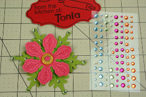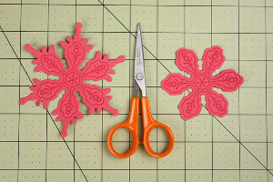 Layer both snowflake die-cuts one top of one another, matching the centers. Use a paper piercing tool (or a thumbtack) to poke a hole through the centers. Insert fabric covered brad through the holes and open the prongs on the back. Further embellish the larger snowflake with self-adhesive rhinestones placed over the letter pressed dots at the tip of each point on the snowflake.