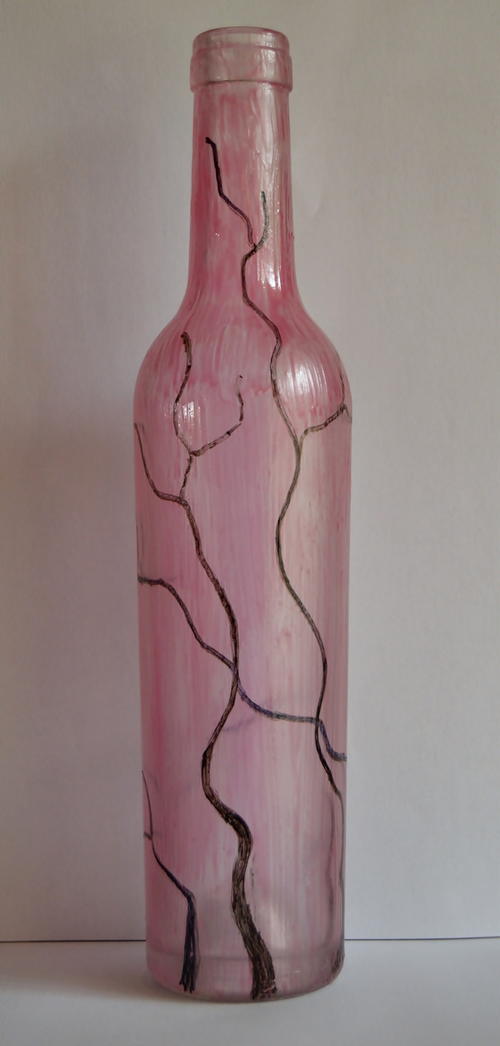 Use the black Artline pen to draw twigs around the body, shoulder, and neck of the bottle.