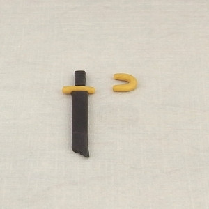 - Create the sword by rolling out a sheet of black clay using the Clay Conditioning Machine on the thickest setting. Use the Super Slicer to cut out the sword shape. Make sure it is 1 ¼” long by 3/8” wide. Cut off the tip to make a diagonal point. Lay the sword on your work surface. Form a 3/8” ball of Jewelry Gold into a thinner log about ½” long. Curve it to form a half-circle and attach to the side of the handle. Form a Jewelry Gold ball about 1/8” wide and flatten it to the top of the handle. Embellish the sword with tiny dots and stripes of Jewelry Gold. Place a tiny strip of gold clay on the very tip of the sword, remembering to form a point. Attach the sword to the arm with a small amount of Bake and Bond. Bake the figure with the decorations and the sword according to the manufacturer’s directions.