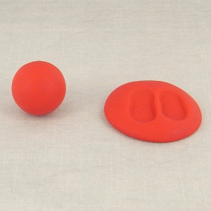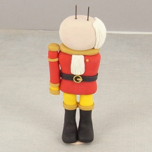 - To create the stand, form a 1” ball of Red Hot Red and flatten it to make a disk about ¼” thick in the middle and about 1 5/8” wide in diameter. Take the cooled nutcracker and set him in the middle of the disk. You want to make an impression of the bottoms of his boots. Firmly, but gently push down while holding on to his legs to make the impression. Make sure the figure is able to stand straight up when the impression is made. Bake the stand according the manufacturer's directions. When the stand is baked and cooled, place a few drops of clear, fast drying glue into the boot impressions. Then, place the Nutcracker into the stand and hold him straight until the glue sets.
