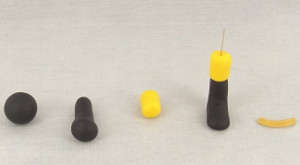 - Create the legs with boots by making two ½” balls of black clay. Roll the balls into two logs about 1½” long. Bend the end of each log to form a boot shape. Stand the logs on the boot shape and define the boot with your fingers. Then make two 3/8” balls of yellow clay. Roll the balls into logs about ½" long for the pants. Join the yellow logs to the top of the boots.