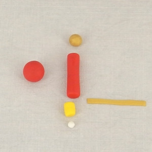 - Create the arms by making two 3/8” size balls of red. Roll the balls into logs about 7/8” long by 1/8” thick. Create the cuffs by making two ¼” balls of yellow and rolling them into logs about ¼” long by 1/8” wide. Attach the red and yellow parts of the arm by gently pressing them together.