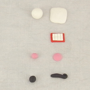 - To make the cheeks: Make two 1/8” balls of Dusty Rose. Flatten them to form disks about ¼” round. Add to the face on each side next to corners of the mouth.