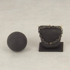 - Make a ball of Jewelry Gold clay, about ¼” across. Form it into a rounded oval shape. Add some Bake and Bond to the middle of the top of the hat to cover the center wire and the two chain links around it. Slide the Jewelry Gold oval onto the wire until it meets the black clay for the hat. If the oval becomes distorted from pushing it onto the wire, smooth it back into shape.