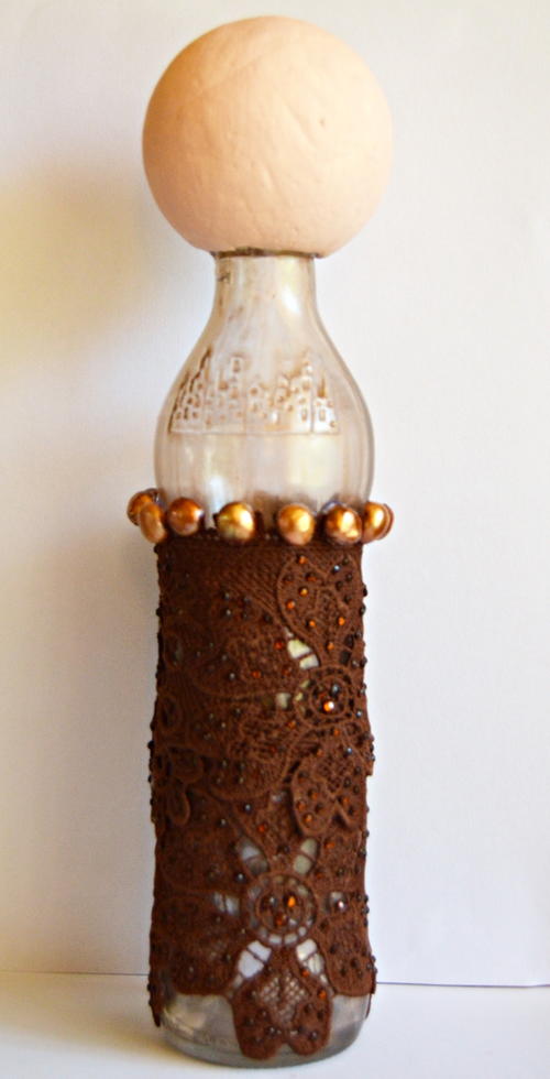 Use the glue gun to glue a piece of lace trim around the bottom of the bottle to make her dress. Cut off the remaining lace and add a second piece that overlaps with the first to complete the dress.