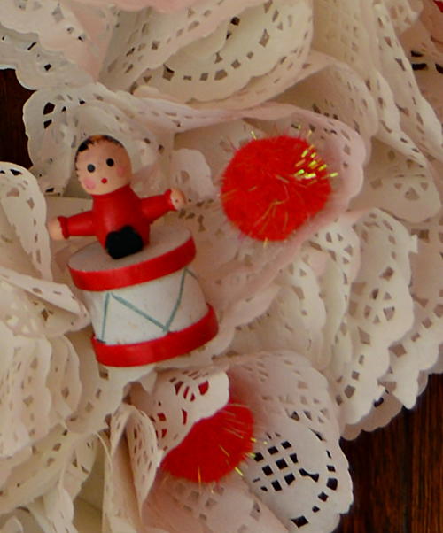 I have done something similar for a wreath base by using a cardboard box and cutting a circle. I padded it and wound a strip of cloth around it to cover the padding, then treated it like a regular wreath form. I like the doilies! They make a very pretty wreath. I found a bag full of tiny ornaments at the thrift shop that would be perfect.