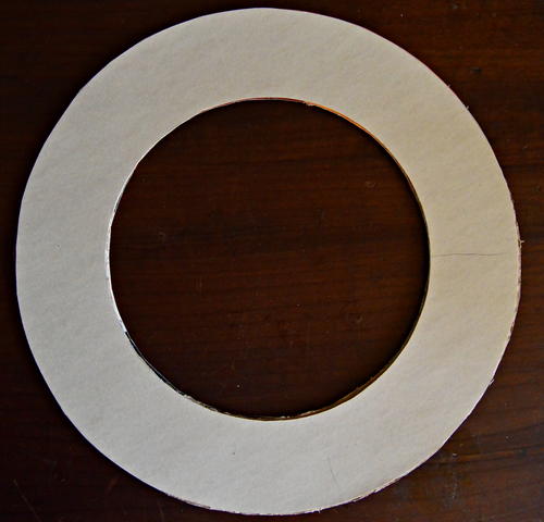 Trace a circle with a diameter of 11.7" on the lid from the cardboard box and cut it out. Center and place the plastic lid with the diameter of 7.4" on this circle, trace around the plastic lid and also cut out the inner circle.
