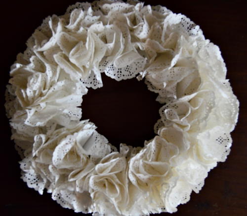 Add the second doily in the same way, gluing it right next to the first. Keep adding doily flowers until the wreath base has been covered.