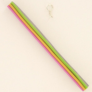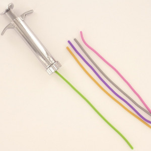 - With the Sculpey Clay Extruder and a 1/8" circle die, extrude strings of Purple Pearl, Silver, 18K Gold, Magenta Pearl, and Bright Green Pearl.