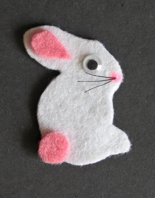 Cut a small circle and small teardrop from the pink felt. Glue the pink teardrop onto the bunny's ear and the pink circle onto the bunny's tail.