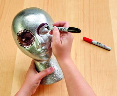 Coat both heads and skull with decoupage and let dry. Spray both heads silver and the skull gloss black and let dry.