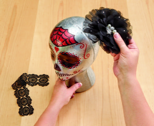 Use markers to embellish the faces of the two heads. Pin the flower accessory to the female head and glue the black lace around her neck.