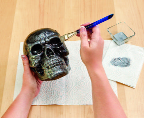 Dry brush the silver acrylic paint onto the skull leaving the black showing through the crevices as shown.