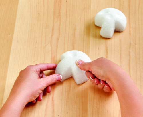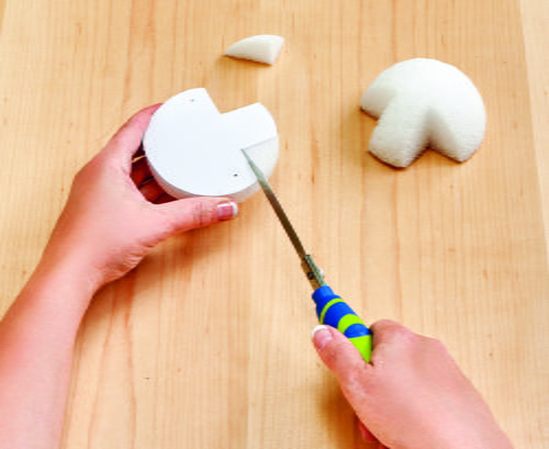 Cut the 4” balls in half with the serrated knife. Cut out the template and pin it to the cut side of a half ball. Cut out the pie-shaped notches to create the bottom portion of the skull. Roll the edges firmly against the table to round the cut edges and shape the back of the skull. Repeat to create desired amount of skulls.