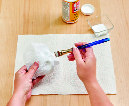 Insert the eraser end of the pencil into the center of the rounded side of the 1.5” ball and remove. Lay a stack of tissue circles centered over the hole. Place the pencil eraser end on top of the stack and insert the tissue into the hole, remove the pencil carefully. Repeat to create six flowers.