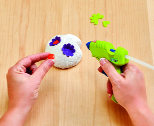 Glue the felt flower buttons into the eyes and glue the 15mm buttons into the centers. Cut apart the felt buttons to create small heart shapes for the nose and glue in place.