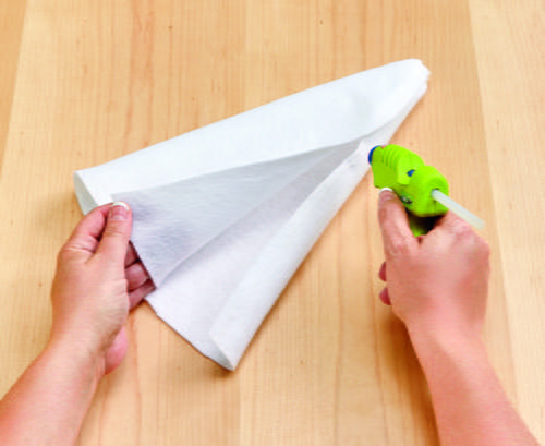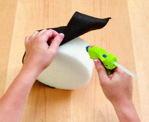 Cut a triangle from the white felt that is 24” at the base and 13” tall. Glue the felt triangle into a cone shape, overlapping the edges about a ½”. Place the foam cone inside the felt cone. Trim and fold the top of the felt neatly over the top of the foam cone to secure in place.