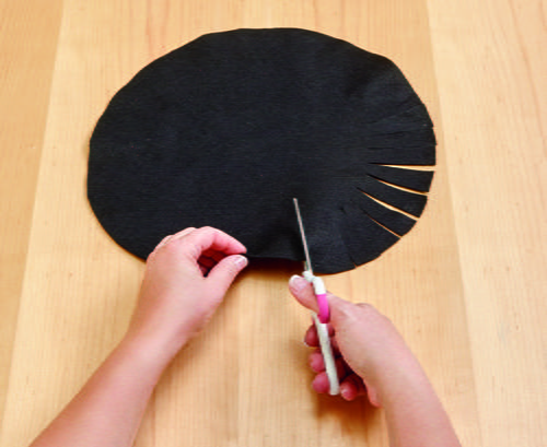 Cut two 16” circles from the black felt. Use scissors to cut wide fringe into the edge of the two circles. Cut the fringe about 3” long and about 1” wide. Be sure that both circles have the same number of fringe as they will be paired up and tied together. Sandwich the disc between the two felt circles.