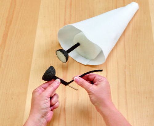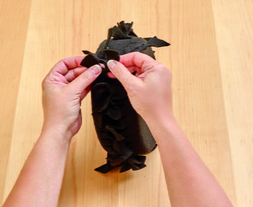Wrap black chenille stems around the legs to completely cover. Glue the legs into the bottom of the body about 2” apart.