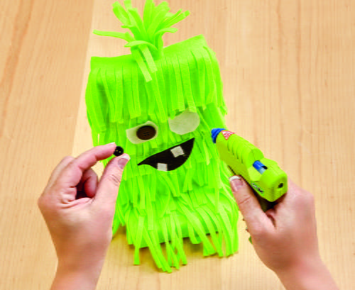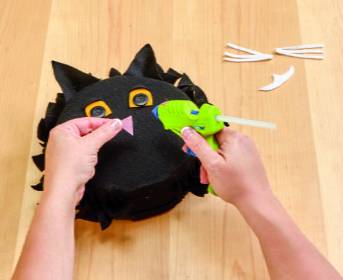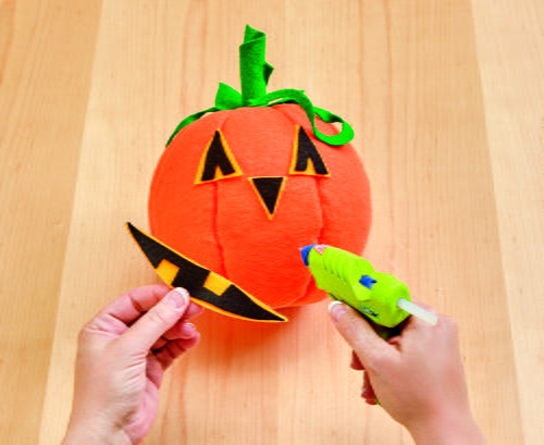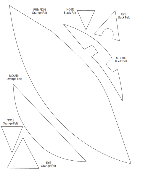 Cut the triangle eyes, nose and mouth from yellow felt. Cut the eyes nose and mouth out slightly smaller from the black felt. Be sure to cut out the notches for the teeth in the black felt. Glue all the parts in place. Glue orange buttons to the eyes.