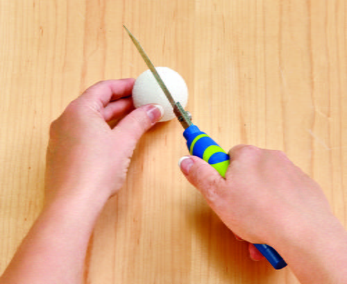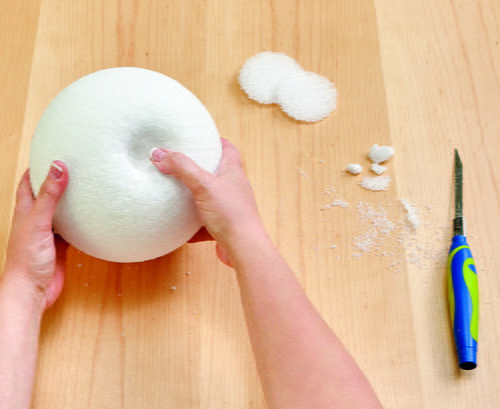 Cut a small flat spot off the top and bottom of the 8” ball. Cut a small 1” hole about 1” deep in the top of the ball. Use your fingers to press in the foam around the hole to create a rounded slope at the top of the pumpkin.