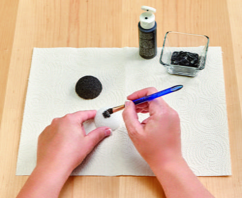 To create the legs and feet, cut the 1.5” ball in half. Paint the two halves black and let dry. Cut two 3.5” lengths of dowel and paint black as well. Glue the dowel into the top rounded side of each ball and set aside.