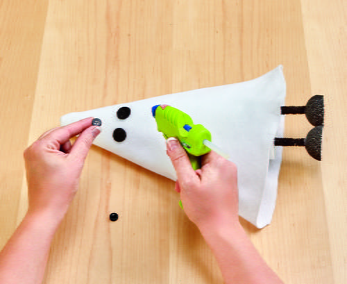 Cut out the face parts from the black and white felt. Glue the parts in place. Glue large and small buttons to the eyes.