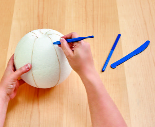 Cut seven 12” lengths of string. Pin the strings around the pumpkin from top to bottom evenly spaced. Use the tuck tool to press a line along each of the strings from top to bottom. Remove the strings.
