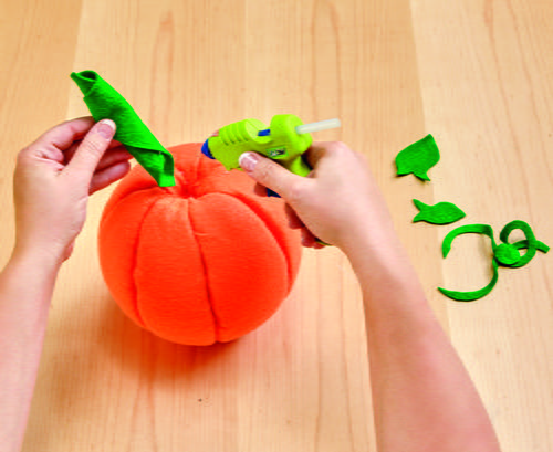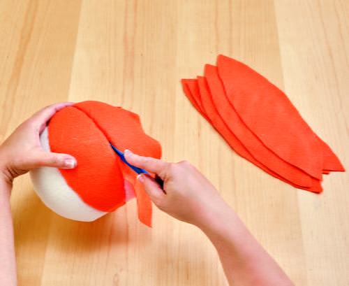 Cut the seven pumpkin sections from the orange felt using the template as a guide. Lay a felt section centered over the scribed section on the pumpkin. Use the tuck tool to tuck the edges of the felt into the scribed lines. Alternate tucking the felt on each side of the section to keep the felt smooth. Repeat to cover the rest of the pumpkin.