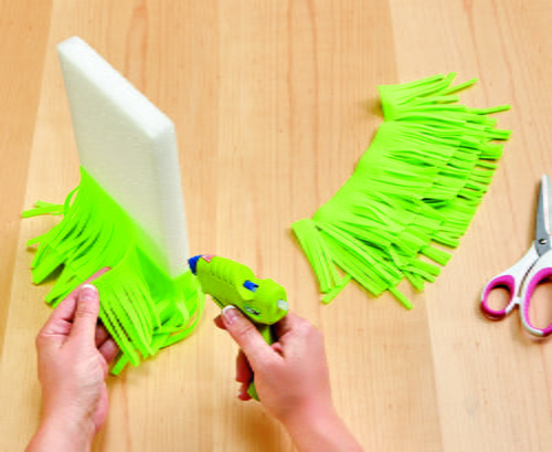 Cut five 9” x 4” pieces of felt. Cut ¼” fringe about 3.5” long along the 9” edge of each piece. Cut one 9” x 5” piece of felt and cut ¼” fringe about 4.5” long along the 9” edge. Glue this piece across the front of the 2” base and around to the back. Glue the remaining fringed felt layered up the front of the body evenly spaced.