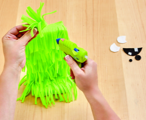 Cut a 9” x 3” piece of felt and cut fringe the same way for the hair. Loosely roll the fringe from 3” edge to 3” edge. Glue the hair to the top of the head.