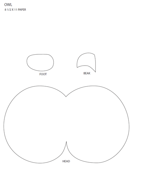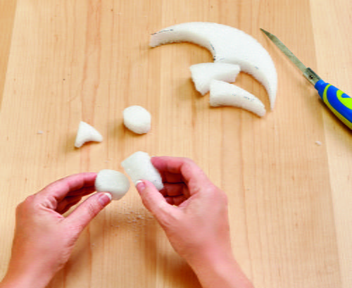 Use the knife to cut the beak and the feet templates from the scrap piece of foam. Use scrap pieces of foam as sanding blocks to “sand” the edges of the beak and feet smooth. Paint the parts orange/yellow and let dry. Glue the beak to the face centered below the eyes. Glue the feet to the front of the body about 1” apart.