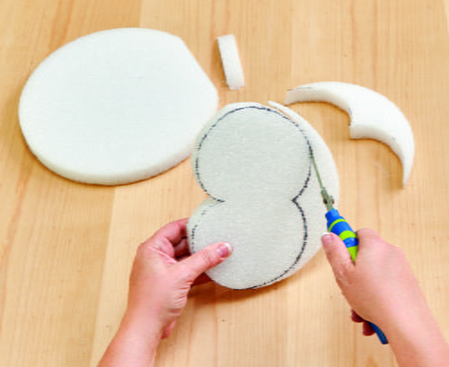 Cut out the face template and pin it to the 8” disc. Use the knife to cut out the template from the foam. Cut a small flat spot off one side of the 10” disc, this is the bottom of the body. Glue the head to the front of the body slightly tilted to one side.