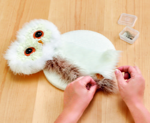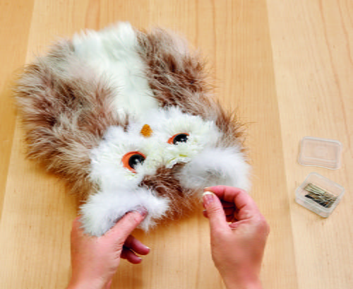 Pin the faux fur centered down the front of the body draping over the feet. Pin a length of white boa outlining the owl’s eyes and under the beak. Pin lengths of brown boa to cover each side of the body and the top and sides of the head. Pin two small loops of white boa in a “V” shape to the top of the head for the owl’s horns. Pin the hat to the head.