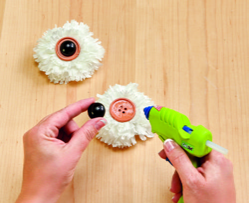 Glue the orange buttons into the center of the mums. Glue the black eyes into the center of the orange buttons. Glue the mums snug against the foam, centered side by side on the face.