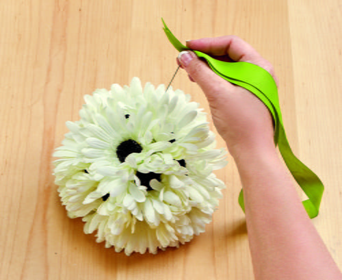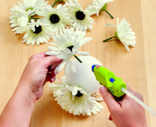 Insert the flowers into the balls side by side to completely cover. Apply glue to each stem before inserting for a more secure hold. Insert the purple flowers into the 6” purple ball, the lavender flowers into the 5” lavender ball and the white flowers into the unpainted 4” ball.