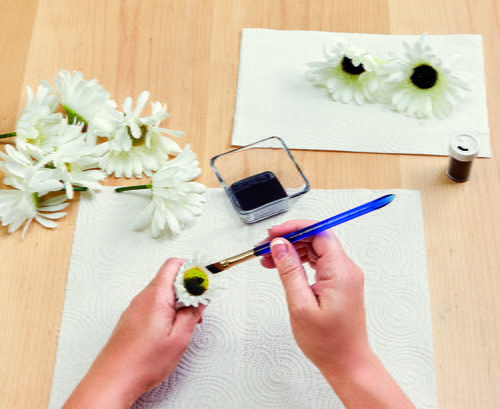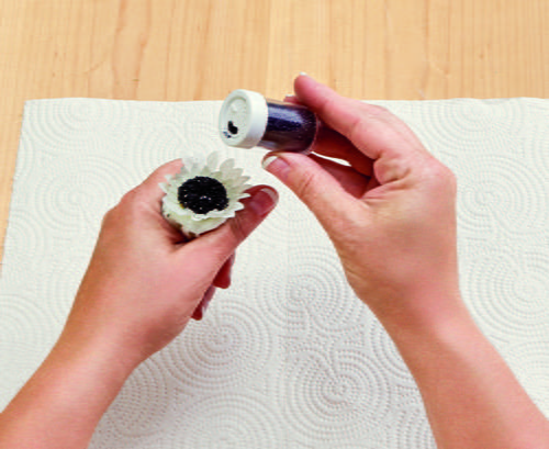 Paint the centers of the flowers black and while the paint is still wet cover with glitter. The paint will secure the glitter to the flowers as it dries. Let dry.