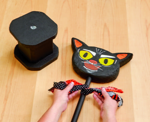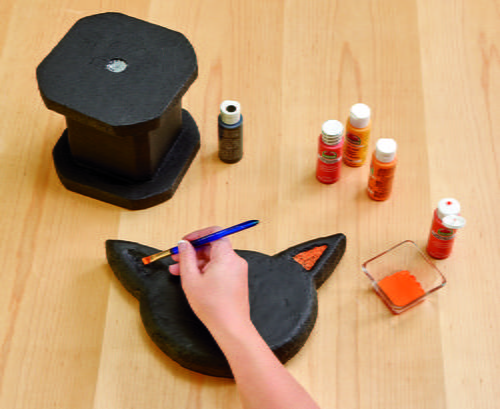 Paint the stands, dowels, cat and bat black and let dry. Paint the indented areas of the pumpkin grooves, the eyes, nose and mouth and the stem black. Let dry. Paint the face on the cat and bat as shown and paint the pumpkin off white. Use a smaller brush to apply a little off white paint over top of the black indented areas and the stem using a dry brushing technique to give a distressed look. Dry brush a little orange paint around the mouth, cheeks and face of the pumpkin to highlight.