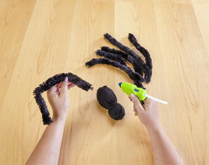 - Cut eight 12” lengths of jumbo chenille. Separate the yarn and insert the chenille into the foam body (four on each side) for legs.