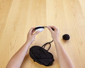 - Wrap the egg and the ball with black yarn to completely cover, gluing the ends to secure. Insert a toothpick between the parts and glue together.