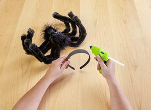 - Glue the eyes in place. Cut and pin a piece of feather boa around the back of the body and around the face of the spider. Glue the spider to the headband.