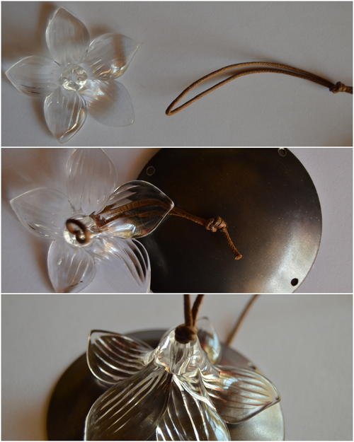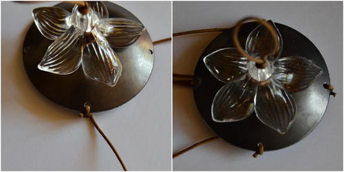 Push the other end of the cord through the center hole in the pole cap and pull tight, so that the knot will be right on the pole cap. Starting at the bottom of the lucite flower bead, push the top of the loop through the bead.