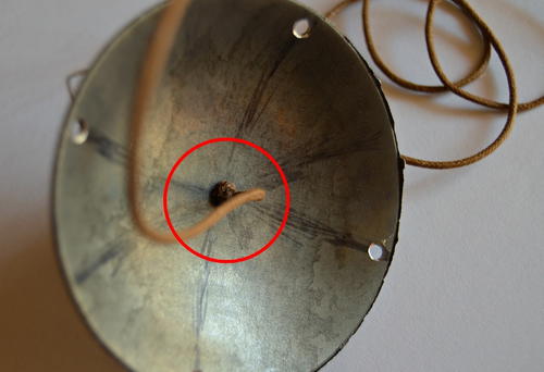 Take a second piece of wax cord and secure with a knot to one of the holes around the edge of the pole cap. Do the same with the other three pieces of wax cord and the remaining holes. Neatly cut the shorter ends of the cord and add a drop of Super Glue to each knot.