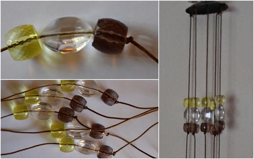 On each of the five wax cords below the pole cap, thread three beads. Start with a light yellow spacer bead, followed by a clear spacer bead and lastly a brown bead. Check that all the beads are the same distance from the pole cap and make a knot below each group of beads to keep them in place. Add a drop of Super Glue to each knot.