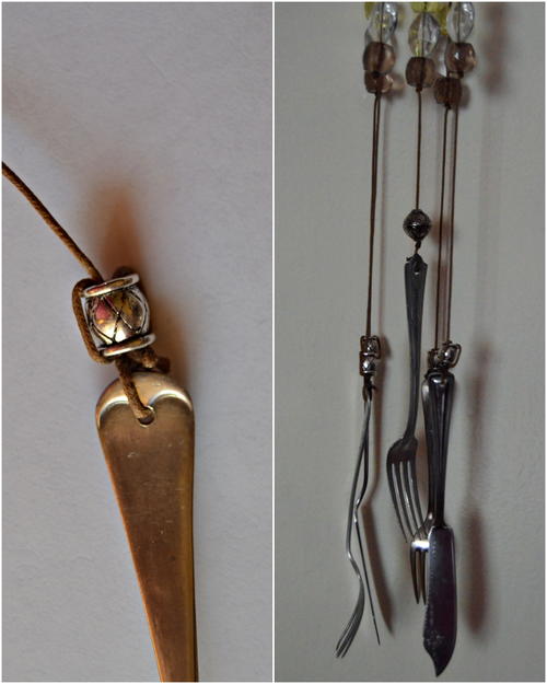 Add the silver ball bead to the center cord, and a spacer bead to each of the outer cords. Make a knot below the bead and then add a knife or fork below each bead. For the outer cord, alternate between a fish knife and a fork. If using an odd fork, place that one in the middle. Before pulling the knots tight, check that the outer knives and forks are the same height. The center fork must be slightly higher than those on the outside to be able make the sound. Add Super Glue to the knots.