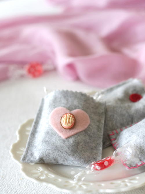 Easy Felt Valentine Treat Bags - These Valentine Treat bags are easy to make using materials you may have on hand. You can make these treat bags with scraps of felt, buttons, craft embellishments, and craft glue.