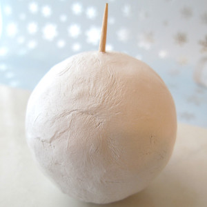 - Create this step a day ahead to leave enough time for the piece to dry and harden. Take a piece of the White Polyform Model Air, and roll out a thin layer with your acrylic roller. Cover your 2” smooth foam ball with this layer. Press firmly with your fingers. Insert a toothpick into the top of the ball. Set it aside to dry for at least twenty-four hours.