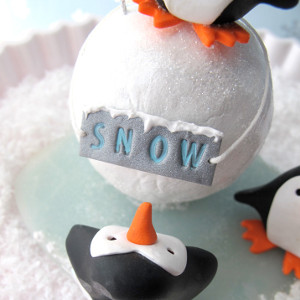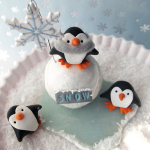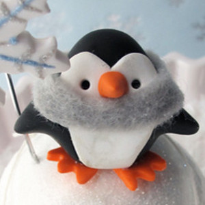 - Once the pieces are cooled and all the details are added, glue the penguin you want to sit atop the snowball onto the toothpick. Put the snowflake on the wire and tie the "SNOW" sign around the ball. You can glue the other two penguins around the base or leave them unglued so you can move them around.